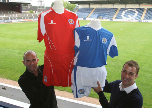 ![]() Jim Thomson holds up the away top whilst Andy Aitken shows off the home top. Pic. Angus McDougal, Photo, Dfs. 07 850 790 251 |