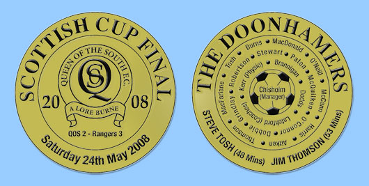 Queen of the South Football in conjunction with John McQueen, Engravers, Galloway Street, Dumfries, have produced a Commemorative Medal to mark the achievement of the Club in what has been their best ever season in Scottish Football. The medal (pictured above) is produced in an antique gold finish and comes in a presentation box. The First Edition is a limited edition with each medal having itıs own authenticated certificate and number. These can be ordered from the Club Shop at Palmerston Park or by e-mail or through Barbours, Buccleuch Street, Dumfries, Tourist Information Office, Whitesands Dumfries, McQueen, Engravers, Dumfries Lowıs Newsagents Castle Douglas, Johnstones Sports Kirkcudbright or Sport and Trophy Centre, Lockerbie. Priced at only £25 they are an ideal gift for all Queen of the South fans to have as a souvenir of a fabulous season. The medals can be posted out, please add £5 for p&p as due to their special value they will be sent by 'special delivery'. John Paterson |