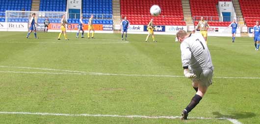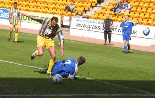 The goal which would win the game finally arrived in 65 minutes and fittingly both the youngsters were involved. Burns won the ball on the left side and intelligently played Gibson away down the left wing. Gibson threw in a great deep cross and Weatherson distracted Cuthbert with a near post leap whilst Derek Lyle arrived at the back post to head his first goal since November 2002! The young keeper did well to get back across his goal and put a hand on the ball but he couldn't keep it out. Three minutes later McCluskey again headed narrowly over the top from a corner as the home team tried to hit back.