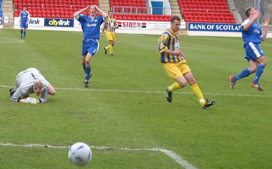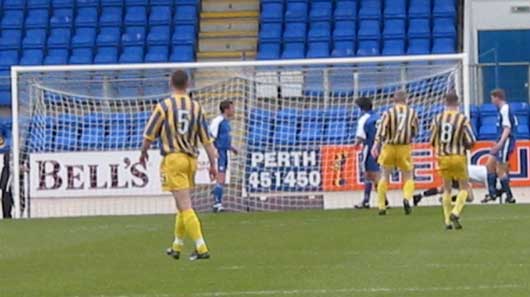 The game though started as a typical end of season affair. Indeed it was 14 minutes in before I made my first note of the game, and that was St Johnstone being forced into an early substitution with Paddy Connolly picking up an injury and being replaced by Ross Forsyth! The first remote chance arrived in 20 minutes when Eric Paton's free kick from 45 yards was missed by everybody trying to get a head on it and ignored by the goalkeeper as it drifted very close to the left post. Three minutes later Paul Hartley almost created something for the home side, making the byeline before crossing into the danger area, but young Burns headed away and when the ball came back in again Jim Thomson hacked it away from the six yard box. From the resulting right sided corner Malone had a free header from 10 yards but was well off target.