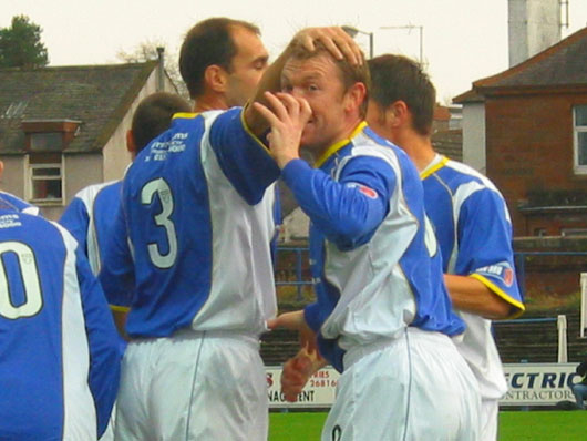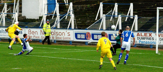 Former Queens hero Peter Weatherson was proving a thorn in the flesh of Jim Thomson today as the former team mates tangled all afternoon. It was Nellie who came off better though with a great finish on a loose ball in the twenty-fifth minute. To his credit Nellie didn't celebrate his goal and showed the Queens fans great respect, an action that drew applause form the Queens fans as Nellie trotted back to the centre spot. Former Stranraer player Kevin Finlayson was also proving to be a problem as he had so often done as a Stranraer player a few season ago.