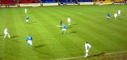 As St Johnstone reorganised with James off the park Queens strove for an equaliser. In 21 minutes Paul Burns made the bye-line and put in a cross which was headed on by Bowey and, although half cleared, Eric Paton had a swipe from 22 yards out fly wide of target. The only Scotland destined for the 2006 World Cup was proving a handful though and one superb run from his own half saw half a dozen players trailing in his wake before he set up Paul Sheerin for a strike across the face of goal that Colin Scott appeared to tip wide although referee Charlie Richmond awarded a goal kick. On 27 minutes, from a free kick rather harshly given for a challenge on Scotland by Wood, Darren Sheridan hammered a shot narrowly past the bottom right corner. Five minutes before the interval Stuart Lovell showed dissent by kicking the ball away following yet another soft free kick given to the home side and was duly booked as a result. Two minutes before the break Ryan Stevenson showed a clean pair of heels down the right side and his cross yielded a couple of opportunities for his side blocked first by Eric Paton and then by Gary Wood.