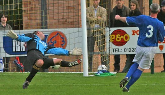 There were some great former stars in the Queens line up and demonstrated plenty of skill and determination to take a 3-0 half time lead. The first goal took many of the crowd back a few years as Tommy Bryce picked up a pass from Derek Townsley and nipped into the box to slide it between the post and Annan and former Queens 'keeper Rab McColm. |