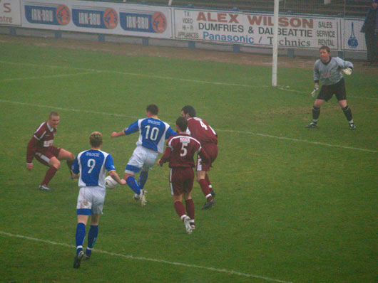 Rose were an unknown quantity with no one brave enough to make any strong predictions pre-match. And as it turned out they produced an entertaining style of football that Queens did well to contain for the first twenty minutes or so. Indeed it was the visitors who produced the best move of the match so far when in 16 minutes Brian Carrigan combined well with Andrew Dick to allow Dick the space to send a shot goalward that Jamie MacDonald dealt comfortably with. This spurred Queens into action and a couple of minutes later the deadlock was broken as Jim Thomson played a ball forward that Sean O'Connor flicked on to Stephen Dobbie. In a move reminiscent of his goal versus Clyde last weekend Dobbie controlled the ball on his chest spun round and fired it into the net past Greig Logan. ![]() Dobbs turns and shoots - From Sandy Robertson in the stand ![]() The ball went from JT to Sean and finally for Dobbs to slam home |