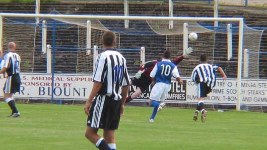 The game was much more lively than previous pre-season openers and the visitors played their part as they demonstrated their fitness in terms of speed and skilful control of the ball. The Queens side was a strong one and it didn't take too long before an opening was made as Willie Gibson showed great skill down the left to set up Derek Lyle with first a header and then a shot on goal early on.