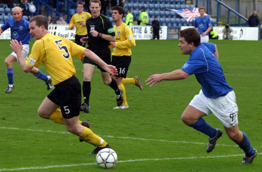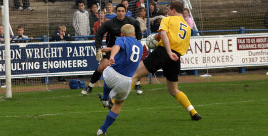 Their lead was not long lived however as the best move of the game was rewarded by a superbly worked goal. Paul Burns broke forward and fed the ball around a Stranraer defender whilst throwing the defender with a dummy. John O'Neill pounced on the ball and steered it round Corr in the visitors goal to bring the home side back level.