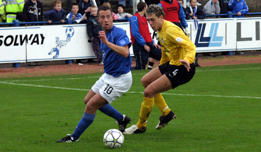 Queens began brightly enough and in just nine minutes Paul Burns had the ball in the back of the net from a very tight angle only to be given offside. However Stranraer showed that they are a determined side with a series of six corners one after the other but with no end result despite some serious scrambling in the Queens defence. It was an evenly contested start and Queens could have opened the scoring on twenty minutes as John O'Neill had a shot blocked by the keeper on his line, the rebound coming back to O'Neill who had another effort blocked again before beating the keeper with a header but seeing the ball scooped off the line by a visiting defender. Shortly after however disaster struck as yet again a careless Willie Gibson moment cost us a goal. In his rush to start a move Gibson gave away possession of the ball straight from a free kick midway inside his own half. Stranraer were quick to pounce and despite efforts being saved by Scott and off the line by Carr, Jenkins finally managed to push the ball home under Carr as he valiantly attempted to save the goal for a second time. |