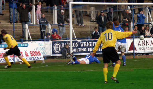 Colin Scott can count himself a very lucky keeper as he received only a booking for what was a clear hand ball outside his penalty area. The resulting free kick found its way into the net but the flag had gone up for offside and the strike didn't count.