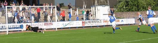 A free-kick on the edge of the box almost worked out as the ball was played across the penalty box to David Bagan, the long-range specialist this time being defied by the visiting 'keeper as he pushed the ball around the post.