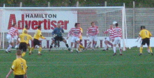 However, after that bright start the game became very static and it was past the half hour mark before Eric Paton's 25 yard free kick forced another save out of McEwan, tipping over the bar. From the resulting corner Jim Thomson climbed high to win the header but the ball fell just behind the lurking Lyle in the six yard box. Queens controlled much of the possession first half without really forcing home their advantage. Accies looked disjointed and, apart from a couple of dangerous crosses, failed to trouble Colin Scott whatsoever. On 36 minutes though Gary Wood could have no complaint about receiving a booking for fouling the dangerous McPhee on halfway as Accies looked to break forward quickly. The Accies first serious effort on goal arrived in the 42nd minute when Steven Thomson met Carrigan's right sided cross with a flashing header which narrowly missed the right post.