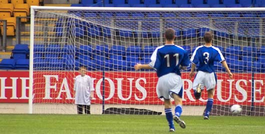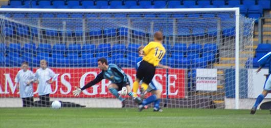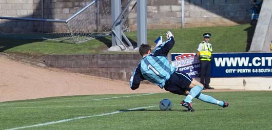 ![]() Out of shot McNiven sends the ball into the net as the back-tracking Perth defence can do nothing but watch |