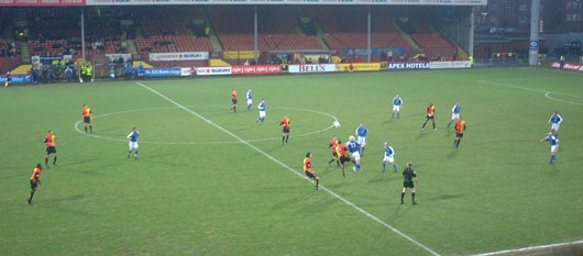 The game kicked off slightly earlier than scheduled and Queens were in front before I'd even finished reading out the team lines on West Sound! In their first attack in the 4th minute Willie Gibson cut in from the left side and struck a decent shot at goal that Kenny Arthur spilled. The alert Derek Lyle was first to the loose ball and duly knocked it home from about 6 yards out. |