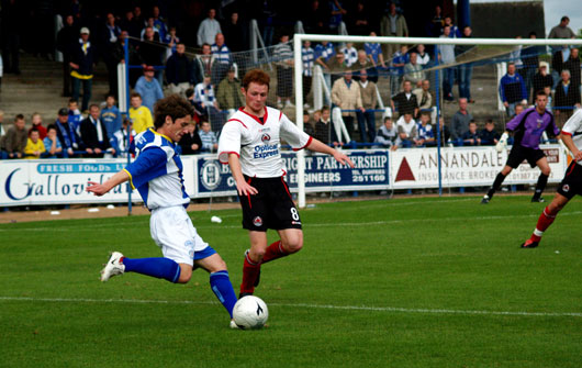 On twenty five minutes Queens took the lead. Neil MacFarlane went down inside the box and without hesitation the referee awarded a spot kick. Stephen Dobbie made no mistake and buried the ball into the back of the net with Hutton well beaten. |