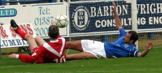 Airdrie posted notice that whilst they were not one of the better teams to have visited Palmerston in the opening quarter they were still capable of providing the home fans with a fright as a Prunty cross ball beat Scott and reached the back post area where both Jim Thomson and Gary Twigg met, Thomson doing enough to force the Airdrie forward into only hitting the post with his effort on goal.