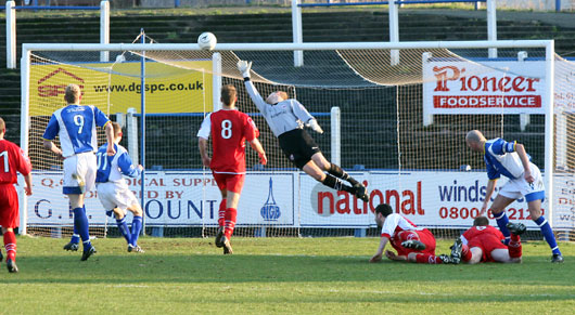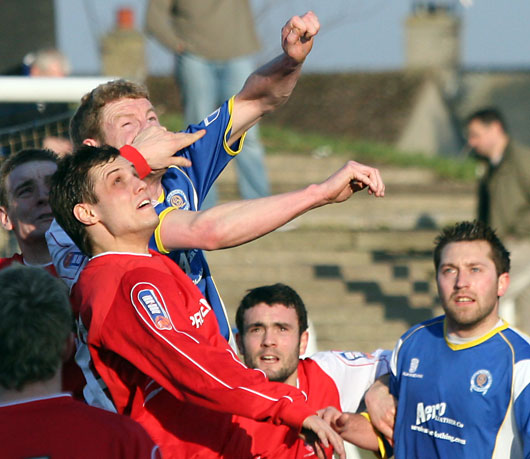The game began with a bang and in the first ten minutes Queens should really have been three goals up. As it turned out though it was just the one goal lead as first a gilt edged chance set up by Stephen Dobbie down the left presented the ball to the head of Sean O'Connor, however the big man just didn't get enough on his effort and the ball flew past the post. The second miss was again one that Sean will want to forget. Making the chance himself he found himself free on the right hand side and headed goalward, his effort in the one on one with 'keeper shot past the post. Fortunately though in between Sean's to misses Paul Burns had found the net. Sean was the provider this time as he fed Burns on the right and the diminutive winger zeroed in on goal, he was to make no mistake and struck and excellent finish into the bottom corner of the net. ![]() Sean just doesn't get enough contact on the ball |