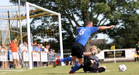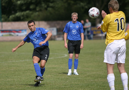 Queens immediately upped the pace and a few minutes later Paul Burns, who was later named Player of the Tournament, was unlucky to see a superb shot pushed onto the bar by the Stranraer 'keeper as he broke through the Galloway sides defence. As often happens though the ten men were proving difficult to play against and whilst they were not creating anything themselves they were making it difficult for Queens to play football and penetrate their defence. |