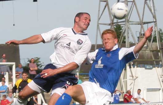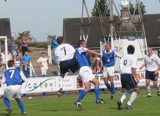 The match began at a brisk pace with both sides looking to make an early impression, it was County though that looked the more troublesome as David Winters down their left posed most of the problems for the home defenders. It was therefore a bit out of the blue when, in the eleventh minute, Eric Paton made some space for himself on the edge of the County box before shooting toward goal, his effort was not one of his best, it was low and slightly across Stewart in the visitors goal, the 'keeper though couldn't hold the effort and spilled the ball right into the path of the in-rushing Derek Lyle who accepted the opportunity with pleasure and buried the ball in the back of the net to open his league account for this term.