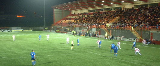 With quarter of an hour to go Torres did very well to elude Jim Thomson and skip to the bye-line where he fired a dangerous ball to the near post and Stuart Lovell did superbly to clear under pressure. The resulting corner was dropped right on top of Richie Barnard and as bodies piled in the ball was somehow scrambled away for another corner which was dealt with rather more comfortably. In the 84th minute Barnard came to punch a Fleming cross away and failed to get any real distance in it. Sheer luck though meant the ball fell too far away for any of the home side's players to make the error count. Two minutes later James McArthur got the break of the ball to race away from Jim Thomson down the Accies left side and forced the big centre half into a desperate tackle from the back. Although he did actually appear to get the ball fairly cleanly referee Craig Thomson decided it was a foul tackle from behind and produced the game's first yellow card. With two minutes of the ninety remaining Billy Reid made his final change bringing on Mark Gilhaney for Brian Carrigan. A minute later Derek Fleming tried his luck with a 25 yard free kick which, though hit powerfully, was straight at Barnard and easily held. Bizarrely, despite allowing lengthy treatment in the half to both Paul Burns and Raymond Jellema and the use of four substitutes, referee Thomson opted to blow for full time exactly on the 90 minute mark so we were forced into extra time. To be honest, after two tight draws at Palmerston we shouldn't have been surprised. Unfortunately we perhaps also shouldn't have been surprised after Saturday that Accies took just 45 seconds of the extra period to break the deadlock and take the lead for the third time in this trio of games. It came from an unfortunate bounce on the right side. Tommy English and Brown Ferguson went into a tackle at exactly the same time and both took the ball cleanly. Unfortunately the ball spun up in the air and came down perfectly for the Accies man to flight in a wonderful cross to the edge of the six yard box and there it was met with an equally good header from Rudy Torres which gave Barnard no chance at all. |