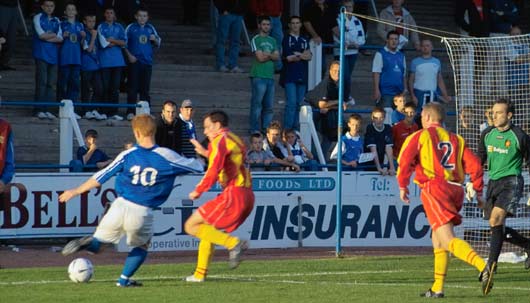 The fans were anticipating that this would kick-start the match and indeed for the remainder of the half the tempo of the match stepped up but it was not all Queens. Firstly Gary Wood and Steve Bowey contrived to deny each other a chance as they both challenged for a cross ball, then at the other end Colin Scott had to look sharp to get down to a Marc Mckenzie effort whilst moments later Paul McManus should have done better but was caught off balance as he turned and fired an effort past Colin Scott's post. The half finished with a Gary Wood header from an Eric Paton cross going just past the post.