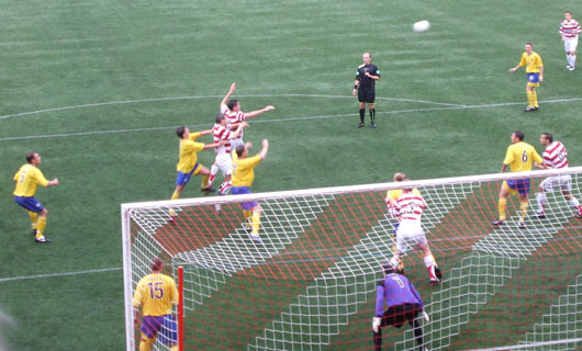 The early drama in the second period concerned Hamilton's keeper, Bryn Halliwell, who crashed into his own centre half Elebert whilst clearing a ball under pressure from Mole. He received some five minutes of treatment on the park but couldn't carry on, leaving the park clutching his shoulder. The Czech keeper Alex Cerny was his replacement. Queens immediately lofted a high ball in on him from their first corner and he fumbled it but O'Neill chip of the loose ball missed the top corner of goal. |