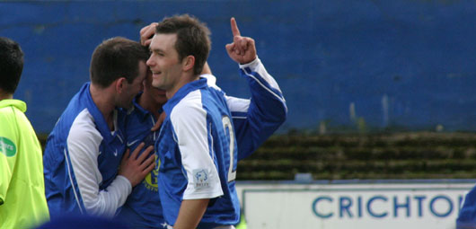 Fifteen minutes into the half and the visitors drew level as a routine deep ball to the back post somehow was unchallenged and met by the head of Andy Lawrie to beat Richie Barnard. Half an hour into the half an indecisive attempt by Barnard to come for a ball on the edge of the box saw him have to pull off a great block from Duffy as the young striker nicked the ball before the 'keeper could get to it. Just after that Alex Williams was introduced for Brian McLaughlin with Derek Lyle dropping back into the 'hole'. Williams had the chance to become an instant Palmerston hero as a Brian McColligan run down the right and cross onto the toe of Williams looked a sure goal, but somehow Williams could only screw it past the post. The final action of the half saw Eric Paton picking up his first booking of the season. In summary it was a much improved performance and Queens more than deserved a point from the match. |