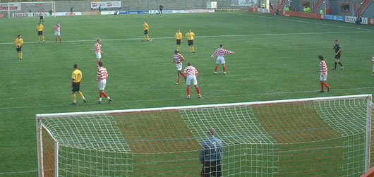 Derek Lyle was continuing to get involved with defenders and seemed also destined for an early bath so his manager took the decision out of the referee's hands by sending on Alex Williams for him in 84 minutes. A minute later McPhee could have snatched an undeserved winner for the Accies when he headed over Corcoran's cross from close in. However, the final whistle did eventually go not far short of 5 o'clock with honours shared. |