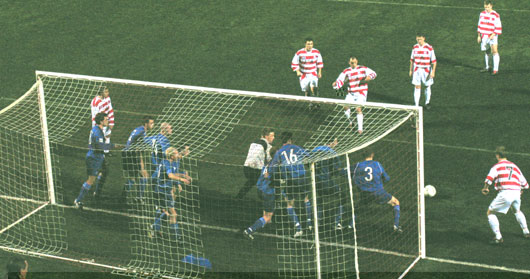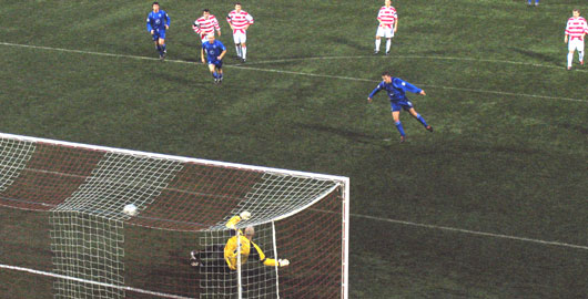 ![]() Gary Woods' wonderous control in his 'pass back' to Scott resulted in the fifth Hailton goal as No.7 Ferguson waits to turn it home |