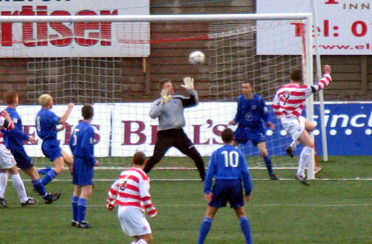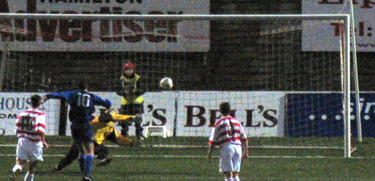 Needless to say, having had their let-off, Accies doubled their lead on 32 minutes. Paul Burns did well to win the ball in a challenge with McMullan on the edge of his own box but as the ball bounced into the penalty area he seemed to catch McMullan before the ball and Mr Toner had no hesitation in awarding a penalty. Derek Fleming made no mistake from the spot, sending Colin Scott the wrong way. A minute later as Gilhaney broke up the right side his cut back into the box was only just deflected away by Burns as McLeod closed in. On 35 minutes Brian McColligan picked up the first booking of the day for a fairly cynical foul on Gilhaney and from the resulting free kick Accies scored again. This time when Fleming lifted the ball into the box Paul McLeod again was the man on the end of it. His first shot was parried out by Scott but it came back to him and this time his effort bobbled over the keeper into the net.