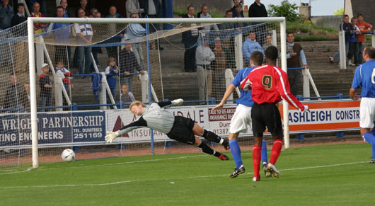 Flying winger Brendan McGill broke down the right hand side past Tommy English on fifteen minutes and sent a deep cross to the back post where Hawley had his effort blocked by the feet of Richie Barnard.