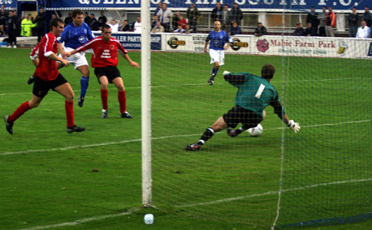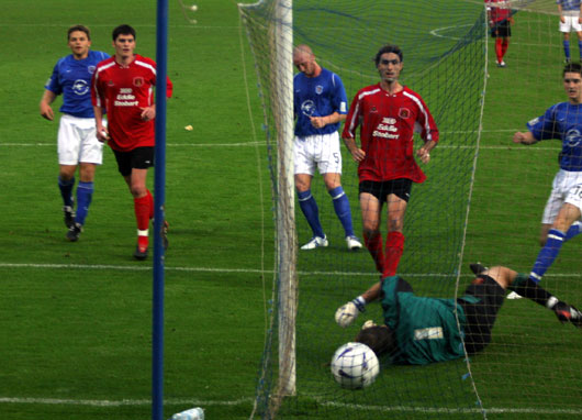 The home side lined up with holiday returnee Jim Thomson immediately restored to the centre of the defence and club captain Steve Bowey returning from injury coming back into the heart of the midfield. Willie Gibson was given a starting role on the left with Brian McLaughlin having to sit on the bench for sixty minutes. Carlisle started at full speed and immediately put the home side on the back foot - so much so that the ball was in the back of the net in the first minute for what looked a good goal only for the assistant referee to rule it out as the marksman was in an offside position. It was only a short reprieve though as four minutes later Jim Thomson gifted the ball to Nade who then setup Karl Hawley with a simple tap in to open the scoring. It looked ominous for Queens as the Cumbrians had the game firmly in their control with Queens being closed down with no time on the ball given by their opponents. |