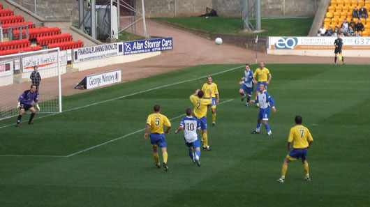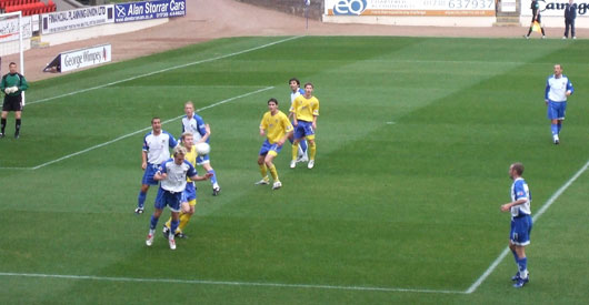 With 14 minutes to go Paul Burns came on for John O'Neill and shortly afterward McQuilken and Harris worked a move down the left side that ended with the former placing a shot wide of target. Owen Coyle then made his second change as Wetherston replaced McLaren. Seconds later Jim Thomson denied the speedy front man a strike at goal with a last ditch tackle. Gordon Chisholm made his final change with 8 minutes left as Bingham replaced O'Connor. |