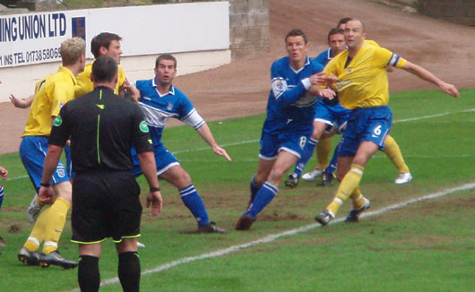 The home side took 17 minutes to register a shot on goal and when it came, via Lauchlan's error, Hardie's drive went wide having hit Jason Scotland! On 25 minutes Peter McDonald was booked for a bad challenge on Eric Paton but minutes later Jim Thomson joined him in there for a challenge on Scotland. In 39 minutes disaster struck for Queens when Jim Thomson conceded a corner with the loose ball from a shot. When Sheerin's kick came in Jamie MacDonald appeared to get to the ball but fumbled it under pressure from Martin Hardie and there was Andy Lawrie to head the loose ball into the net. Before the game restarted Steve Tosh picked up a yellow card for something he said to the assistant referee.