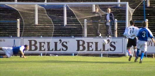 ![]() McNiven is still airborne as his powerful penalty kick evens the score early on |