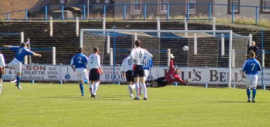 Queens started with some promise and within the first few minutes Jim Thomson could have opened the scoring as he rose above the visiting defence to power a header just wide from a corner. The first action though occurred down the other end as a corner was not properly cleared and from the foot of Brian Reid the ball reached David Nicholls on the edge of the box who fired the ball home past an unsighted Colin Scott to give the Bairns the lead. |