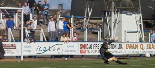 Whilst Falkirk were enjoying the bulk of the pressure Queens were still managing to make some chances and on 25 minutes Steve Bowey got himself into a good position as he cut across the face of the visitors box looking for an opportunity to unleash a shot, however the toe of Kevin James obstructed Bowsers passage and the penalty was awarded. After the customary 'scrap' between English and McNiven to determine the taker David McNiven buried the effort high past the 'keeper to keep up our 100% record from the spot this term - three so far. |