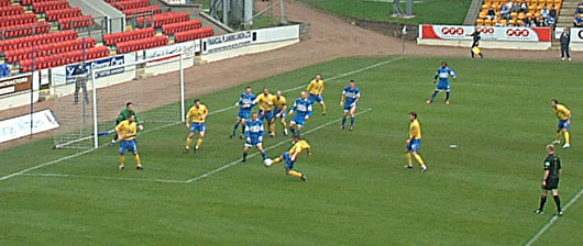Queens should have been back in the game three minutes later though but Willie Gibson missed a gilt edged chance. Steven Anderson played a loose ball across his own back line and sold McManus short leaving Gibson clean through on goal. Unfortunately the wide-man's shot was fired past the keeper and past the bottom right corner too. McCall had seen enough and made two half-time changes. On came Graham Weir and Scott Robertson for John O'Neill and Des McCaffrey. Eric Paton switched wings, Neil Scally went to right back and Queens moved to 4-4-2. Queens could even have pulled a goal back in the 2nd minute of the half when a left sided corner was knocked wide by Graham Weir, six yards out. but any thought that the formation change would improve things was soon dispelled as the home side added a third. Steven Milne's cross again from the right saw Corr come out for the ball and fail to get near it. The keeper clearly felt he was impeded but Mr Mackay allowed play to go on and Paul Sheerin had the easiest of tasks to collect the loose ball and knock it into the net from the left side of the box. |