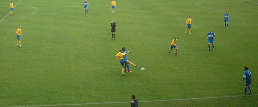 Just past the half hour mark though the home side grabbed the lead. Barry John Corr came out for a right sided cross and tried to punch clear but failed to get enough distance in the ball. Paul Sheerin seized upon the loose ball and chipped a perfect shot into the top right corner despite the attentions of McCaffrey on the goal-line. Six minutes later it was 2-0. Another cross from the right was headed down by Hardie to Scotland and he laid the ball back to Paul Lawson. The on-loan Celtic starlet hammered a low shot into the bottom left corner from 20 yards past the unsighted Corr.