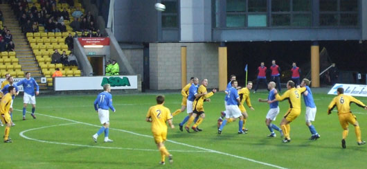 Queens started the brighter and made plenty of early inroads into Livi territory. Craig Wight made a good block from a Sean O'Connor header and then McPake deflected a Paton drive out for a corner. Midway through the half Graham Weir was involved in a clash of heads with an opponent and after a minute or two's treatment he was replaced by Andy Thomson. Whilst Queens were down to ten men though Scott Robertson made a fine burst into the box and looped a shot just over the Livi crossbar. On the half hour mark Andy Thomson spotted Gibson in space on the left and the winger cut inside before stinging the palms of Craig Wight with a curling drive. A couple of minutes later though Liam Fox didn't miss the top right corner by much with a 25 yard free kick. Next up McPake headed a Makel free kick straight at Hinchcliffe and as Queens broke forward, Andy Thomson set up Scott Robertson for another drive at goal smothered by Wight at the second attempt. As the half drew towards a close Queens continued to press and Livingston continued to struggle at the back. With two minutes remaining Robertson seized on another error to rifle a shot at Wight that the keeper parried out for a corner. Next to try his luck was Scally, slicing a shot wide left after good build up play. The half ended with Queens much in the ascendancy but again with no goals to show for it. |