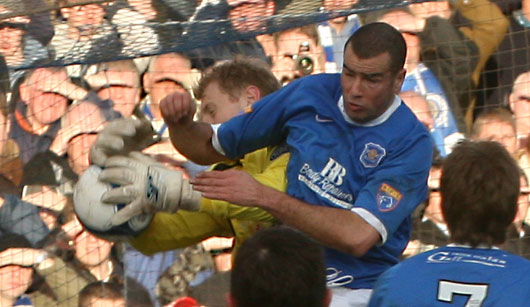 ![]() Jim Lauchlan makes a forceful challenge on Brown |