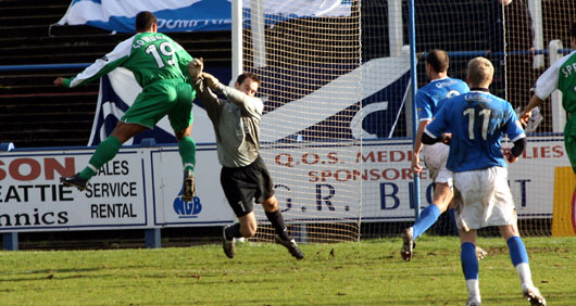 Willie Gibson almost went out with a bang as he beat two Hibs players down the left before cutting in and shooting just over the top. Then again on the half hour Willie broke free and found himself on the edge of the box as he curled an effort that Brown again collected with reasonable ease. Strangely Eric Paton found his way onto the referee's book when everyone else expected a free kick for Queens, he was quickly followed by John O'Neill for a challenge that looked more clumsy than with any intent. Then just as the half was coming to an end out of absolutely nothing came a wonder strike from Hibs left back David Murphy, the ball came out of defence and fell to the former Middlesborough trainee who, from thirty yards, struck an unstoppable shot that MacDonald could only dive despairingly at as it hit the back of the net. A cruel end to the half for Queens who had done enough to be going in level after 45. The second half started with a bang as Queens equalised within the first three minutes. A Jamie McQuilken throw in the bottom left corner was nodded back to the taker by Chris Hogg, this time McQuilken crossed and the ball was met by the head of John O'Neill who finished with some skill to lift the volume at Palmerston way past anything heard in the last few years. |