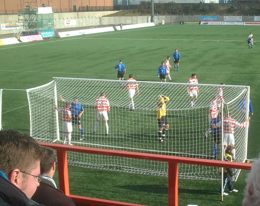 It was not exactly an all action start and indeed it was 15 minutes before I noted anything down, that being an Eric Paton shot that flew about ten yards over the bar! On 22 minutes came a serious blow when Jim Thomson suffered a badly gashed head in a clash with Brian Wake and initially left the park for stitches. However, it soon became clear that he wasn't going to be able to continue and so Gary Wood was brought on in defence this time though by the time he got on we'd played five minutes with ten men. Anything good that Accies were producing was coming through Gilhaney and just before the half hour he turned Shaun Dillon inside out before pulling the ball back for Scott Agnew to loop a shot onto the roof of the net though Barnard appeared to be happy to leave it. Three minutes later from a free kick on halfway the ball was helped into the box and Steven Thomson headed towards the bottom left corner but Barnard covered the effort easily. On 34 minutes a clever pass from Juanjo released Wake clean in on Barnard and with Wood hacking back at him the ex-Gretna man muscled through for a shot and forced a superb block out of Barnard. The rebound was turned back to Juanjo and the Spaniard was unlucky to see his effort go just wide. |