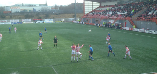 Billy Reid decided a double change was called for and replaced Wake and Agnew with Keogh and Tunbridge. To be honest I wasn't sad to see the back of Wake who caused us more than a few problems all day and a lot more than Keogh did in the remainder of the game. The substitutions were completed on 73 minutes when Andy Thomson replaced Graham Weir who had put in his usual shift up front. Three minutes later Bowey produced a magnificent perfect goal saving challenge in his own box as Juanjo lined up to shoot home from 15 yards out. The home side kept pushing but their hearts must finally have been broken when Mark McLaughlin's howitzer of a strike from 25 yards for the top corner was clawed away by an equally magnificent diving save from the impressive Barnard. A minute later Barnard finally missed a cross and a back post header was turned goalward by Elebert only for the keeper to make a half block and do just enough to allow Andy Aitken time to hammer the ball off the line. There was still time for John O'Neill to pick up a booking for a cynical trip on Gilhaney and Mark McLaughlin to join him there for dissent after an Accies soft penalty appeal was waved away.
