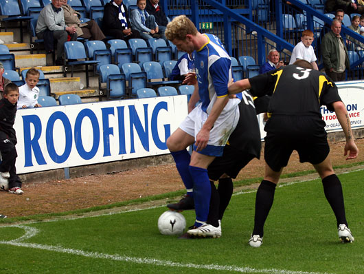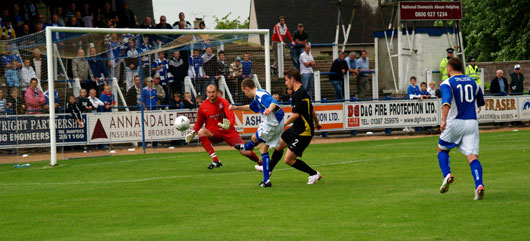 With just less than ten minutes of the half gone that vital goal eventually did arrive. And it wasn't from either of the big guns as it fell to Neil Scally to get that precious strike. It will not go down as one of the prettiest goals seen at Palmerston, Steve Tosh and Paul Burns worked well together and Tosh fed the ball into Scally in the middle of the box, with the attention of Patrick Noubissie, Scalls managed to 'sclaff' his effort over the line to the delight of the crowd. |
