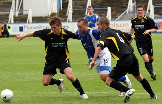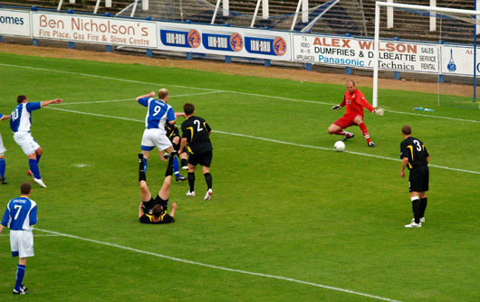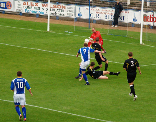 With injuries and suspensions the theme of the season so far it was a relief to see both Jim Thomson and Jim Lauchlan back in the heart of the defence. However due to Eric Paton's injury Jamie McQuilken took on the role of right back and Bob Harris stepped in at left back. The middle of the park was strong with Burns, MacFarlane, Tosh and Scally whilst our first choice strike force in Dobbie and O'Connor both started. On the bench were Bingham, Mole, O'Neill, Grindlay and the 'free to leave' Andy Aitken. Livingston started the match the stronger side but appeared to lack any great firepower upfront. Queens however soon weathered the visitors storm and in six minutes Stephen Dobbie almost beat the offside trap with a neat turn and shot that just flew past the post. The same man should have done better three minutes later as he raced through on the keeper, but Liberda demonstrated his skill early on with a good block to deny Dobbs. Queens were enjoying the bulk of the pressure by the quarter hour mark and a combination of Dobbie, Burns and O'Connor managed to work an opening for Dobbie who rifled an effort past the post. |
