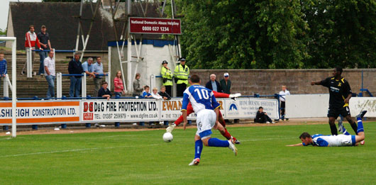 Paul Burns could have done better as he capitalised on confusion in the box as a long clearance bounced awkwardly for a defender who under pressure from Dobbie allowed the ball to run loose to Burns, the new member of the 100+ club blasted the ball over the top as he swivelled to shot back toward goal. |