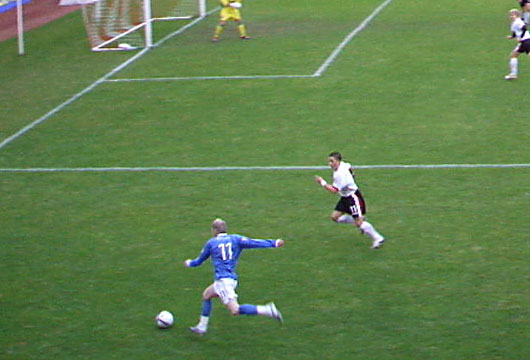 The game had a slow start and Gary Arbuckle was the first to aim a worthwhile shot on goal in ten minutes, his effort deflected away off Lauchlan. A minute later Arbuckle caught McCaffrey in possession in midfield and sent Bryson scampering down the right wing. His low ball in was met by Arbuckle arriving and should have been the opener only to be denied by Colin Scott. Next up O'Donnell tested the veteran keeper from distance but again he was equal to it. |