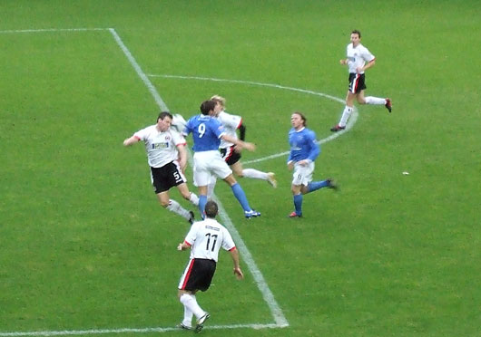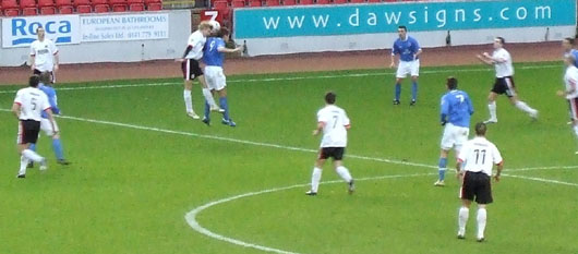 In the 45th minute, from a left sided corner, the ball found its way to Dougie Imrie beyond the back post. He beat his man and rifled a shot across the face of goal which appeared to strike Neil McGregor and then deflect past Colin Scott off Jim Lauchlan. No idea who will claim credit for it! As if that wasn't bad enough 30 seconds later it was two. Bryson broke clear down the right as Queens were caught cold and fired a low cross that Gary Arbuckle, Stephen Swift and Colin Scott all went for at the same time. Again it was far from clear who got the last touch but the guy's with the club video reckon it was Swift. Forty four minutes hard work up in smoke in thirty daft seconds. |
