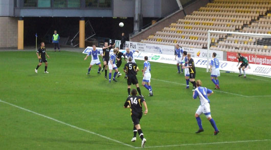 The game was in its 12th minute before anyone even registered a shot at goal, that coming when O'Connor made ground down the left side and pulled the ball back for Scott Robertson to plant a 20 yard effort over the bar.Two minutes later Steven Craig had Livi's first effort but Jamie MacDonald was right in line and smothered easily. In 17 minutes everyone seemed to stop bar Dobbie as he chased a curling ball through. Liberda reached the ball at the same time as the striker and neither pulled out so the ball cannoned off into the crowd. The breakthrough arrived a minute later though as Steve Tosh floated a cross to the penalty spot and Sean O'Connor arrived to lob Liberda with a shot possibly helped by the wind.