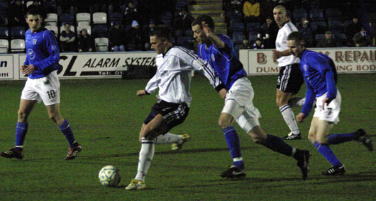 The only change to the Queens line up from the side that had beaten Dundee just a couple of weeks back was Steve Bowey on the left central side of midfield for Brian McLaughlin. It was almost a similar start too with a corner being met by Jim Thomson as he rushed into the box, with his feet on the ground the big man bulleted his header toward the top corner but a slight deflection saw it fly by the wrong side of the post. Queens kept up the pressure and a few minutes later had the ball in the net but Graham Weir was adjudged to have impeded the goalkeeper. |