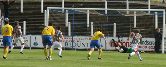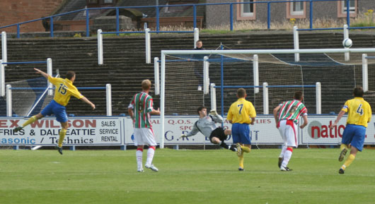 Queens were missing at least six players who could be termed first team starters through injury, some marginal and some longer term but with the first league game looming next Saturday it was wise to rest the marginally fit players today. Carlisle for their part named twenty one players in their squad and effectively changed the whole side at half time. The first half saw seven first team players take the field for the Cumbrians the second half only three. The travelling support was very impressive and it must be many a long day since Queens fans were outnumbered by visiting fans at a home fixture, maybe down to the local holidays starting today but nonetheless a disappointing fact. To the game itself and Queens started brightly pinning back the visitors and finding a lot of room to play good passing football. On the quarter hour Sean O'Connor pulled a ball down for Paul Burns who could only blast over the bar from the edge of the box. Four minutes later and Brian Gilmour tormented the Cumbrians defence as he pulled a deep ball across the face of the goal that both O'Connor and Burns just couldn't connect with. ![]() Bingham works through the Carlisle defence Carlisle were making fewer chances but a ball through the heart of the defence bounced kindly for Grindlay to collect on twenty five minutes. There were shouts for a penalty for Queens as Sean O'Connor was felled in the box after breaking through the Cumbrian rearguard, however the referee pulled play back for a free kick outside the box that came to nothing. A golden opportunity fell to the visitors just after the half hour mark as Stephen Grindley made his only mistake of the day as he fumbled a cross that fell to the feet of Neal McDermott but the United player shot well over the bar to relief of the Queens keeper. Grindlay made up for his error a mere four minutes later as Andy Aitken stuck his shoulder into the ball and conceded a penalty that Grindlay did well to get down low to his left to push away and gather at the second attempt. ![]() Grindlay thwarts the effort Just before half time Brian Gilmour beat the Carlisle 'keeper and a defender to break though free on goal, however in the time it took to compose himself Bradley was back on his line and Gilmours effort was over the top. The half time whistle blew with Queens the more impressive of the two sides. The second half saw just one Queens substitution with John O'Neill on for Sean O'Connor whilst Carlisle replaced ten players! Just five minutes into the half and David Bingham was brought down in the box, as usual everyone was confident that John O'Neill would stroke home his penalty, however the spot king has to miss sometime and fortunately it was today in a friendly that the cars on Terregles Street had to dodge a wayward football! ![]() O'Neill blasts over from the spot |